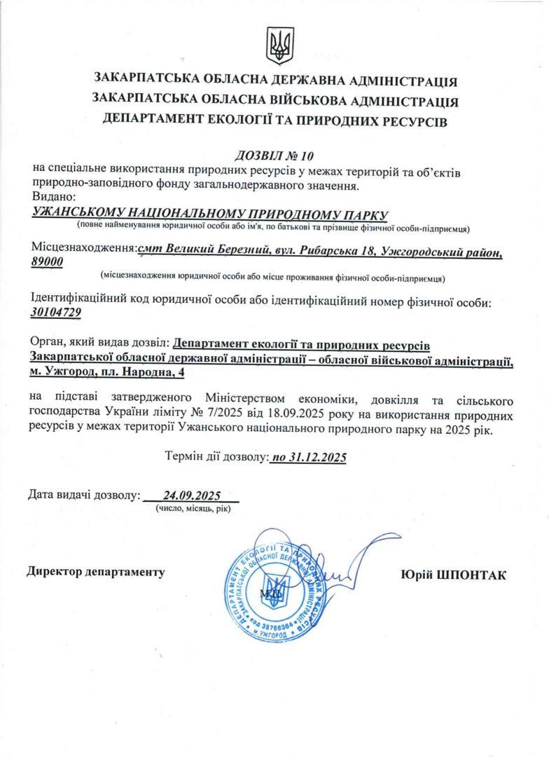 Дозвіл № 10 від 24.09.2025 на спеціальне використання природних ресурсів у межах територій та об’єктів природно-заповідного фонду загальнодержавного значення