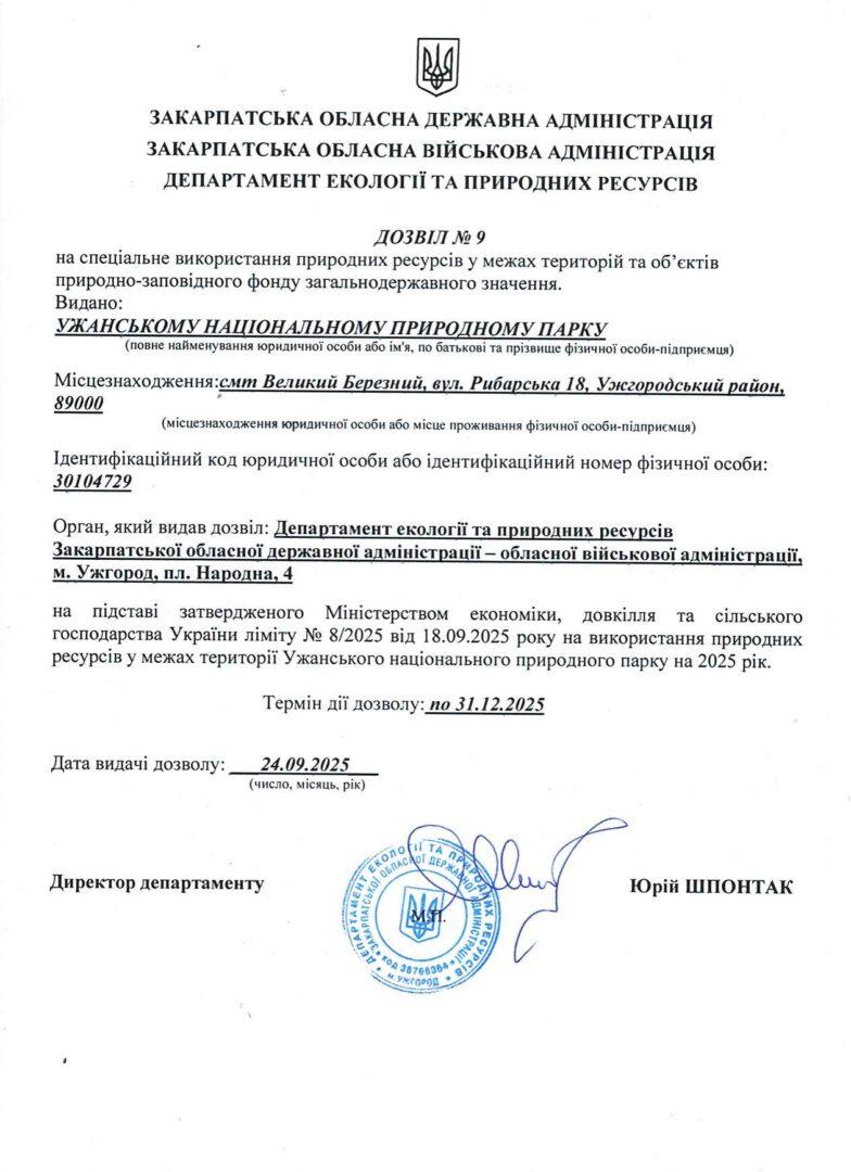 Дозвіл № 9 від 24.09.2025 на спеціальне використання природних ресурсів у межах територій та об’єктів природно-заповідного фонду загальнодержавного значення